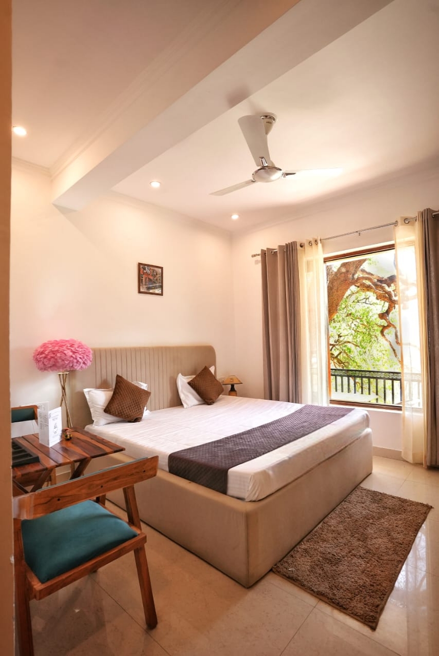 Tucked away in the lush green hills of Mussoorie, this is a lovingly curated 4BHK villa perched just above the bustle, close enough to Mall Road for convenience, yet far enough to offer peace, fresh pine-scented air, and Himalayan views that stay with you long after your trip. This property is located just 500 meters from Library Chowk and is an easy walk from Club Mahindra and Camel Back Road. You’ll find yourself surrounded on all sides by untouched forest, chirping birds, and seasonal flowers in full bloom. There’s a reason locals call this the quieter, more beautiful side of Mussoorie. The villa is spread across two levels. The ground floor has two bedrooms with balconies and sit-out space. Climb up a short flight of stairs (about 25 steps) to reach the first floor, where you’ll find two more bedrooms, a fully-equipped kitchen, and a gorgeous open terrace where you can sip morning chai as the Snow clad Himalayas light up in the sunrise. Each of the four bedrooms is thoughtfully designed with king-size beds, private balconies, wardrobes, portable heaters, ceiling fans, smart TVs, and attached washrooms with hot water and modern fittings. Fresh white cotton linen, essential toiletries, RO water, electric kettles, and study tables are provided for each room. There’s even a backup inverter to ensure lights and fans stay on during power cuts. The wooden furniture is handcrafted in teak, giving each space a timeless warmth. You can enjoy your meals in your private room, the terrace under the open sky, or ask the caretaker to set up a dining corner amidst the trees. You’ll also have access to: • A well-stocked shared kitchen with fridge, microwave, gas stove, utensils and crockery • A chef on call who cooks homely meals as per your taste, delivered piping hot • Board games like carrom, ludo, and playing cards for cozy evenings • Pet-friendly amenities, including cotton bedding for your furry friend • A safe gated environment with CCTV in common areas • Parking space for 3 cars and luggage assistance from the road • Bonfire and barbeque arrangements available on request/cost • Decent sound system available for music on request • Fast WiFi up to 50 Mbps The Villa is ideal for families, nature lovers, couples, and groups of friends who want more than just a place to stay. It’s for those who seek experiences, who enjoy sipping tea at balcony as birds sing around them, who like to take early morning walks on Camel Back Road, and who find comfort in forest silence rather than honking horns. Important to note: • The property is not suitable for elderly guests with knee or mobility issues due to the 25-step approach • Kitchen usage is restricted to light use only. Full cooking is managed by our caretaker • Smoking is permitted only in open spaces like terraces and balconies • Zomato service is limited, but everything you need can be arranged by our caretaker on advance notice • Nearby cafes, street food joints, and tea stalls are just a short walk away • Liquor store is near Library Chowk Local attractions: • Camel Back Road for nature walks • Gun Hill, Cloud’s End, George Everest, Lal Tibba, and Landour • Kempty Falls for a fun splash day • Tehri Lake for a full-day trip and water activities This villa is for those who want to slow down, reconnect with nature, and feel Mussoorie like the old days. It’s not just about luxury, it’s about the soul of the hills. Come with your people, come with your pets, come with your stories. We’ll give you the space, the silence, and the sky full of stars. Note- The location is amazing to experience the breeze and reconnect ,but it's not ideal for people who can't climb stairs . We have car parking which is very rare in mussoorie but the roads are suitable for drivers who can drive in mussoorie roads. If you can't drive in Mussoorie, pls let us know in advance our staff will help in all ways or you can take the electric cart which is available from library chowk ( available till 6pm) Welcome to your own abode in Mussoorie! This is how Mussoorie was meant to feel.
